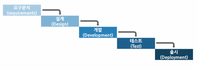 폭포가 위에서 밑으로 흐르는 것을 빗대어 표현하였으며 분석 -> 설계 -> 개발 -> 테스트 -> 출시 각 단계별 순차적인 진행을 강조하는 방법론이다.